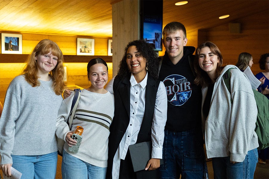 Camara Lundestad Joof (center), author of the 2025 Paideia summer read, spoke at Convocation in the fall, taking time to connect with students afterward.